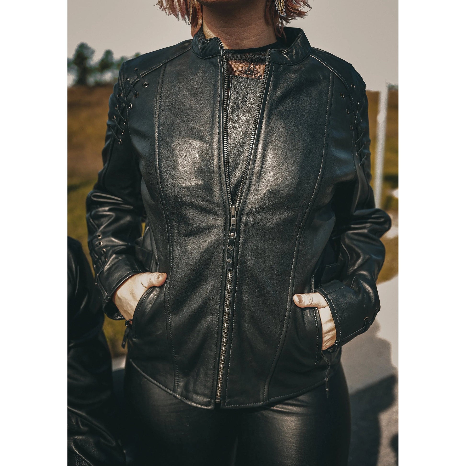 Discover elegance and sophistication with the Juno Ladies Premium Leather Jacket by Derringer Leather. Crafted from luxurious lambskin leather in classic black, this jacket combines modern design elements with timeless style, making it an essential piece for your wardrobe. Step into luxurious comfort and style designed to elevate your wardrobe with its exquisite material, modern design features, and practicality suitable for both casual and formal occasions.