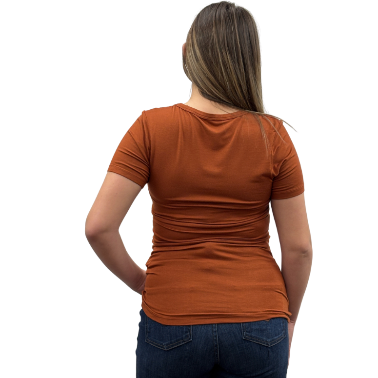 This rust short sleeve V-neck top features a Route 66 "Good Vibes" graphic. A stylish and upbeat piece perfect for casual wear. Order Now and get ready to hit the road in style!