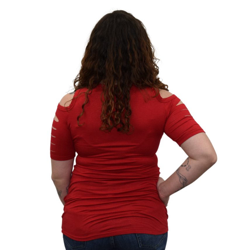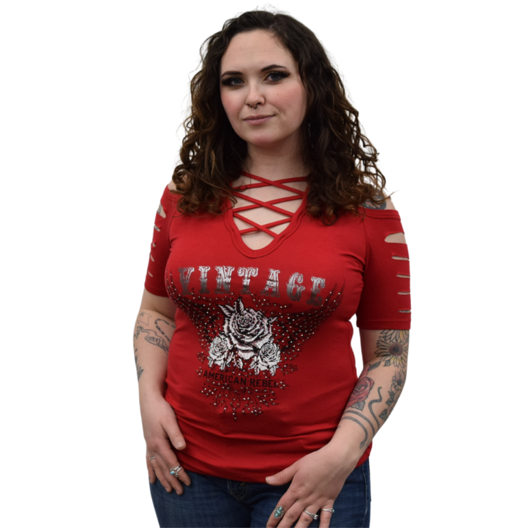 Embrace edgy vintage style with this well-loved body tee featuring intricate roses and wings graphic, embellished with stones for a touch of sparkle. The crossed neckline and cut sleeves add a bold, fashion-forward flair. Perfect for those seeking a unique, statement-making piece with a vintage twist.