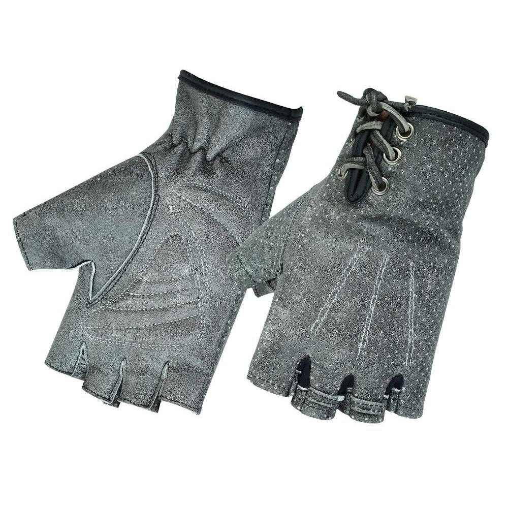 Women's Washed-Out gray goat perforated fingerless glove featuring elastic wrist with grommets and lacing, gel-palm, quick release finger pull tabs and contrast stitching.